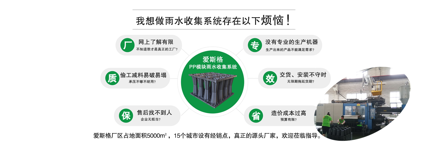 廣州愛斯格環保科技有限公司是一家集雨水收集系統研發、PP模塊生產、一體化機電設備生產、咨詢設計與安裝、運營管理與生產銷售為一體的“EPC總承包模式”高科技企業,已在雨水回收利用及其綜合業務方面處于優秀地位。       我司擁有強有力的團隊支持,可迅速提供技術解決方案與成本的估算,提供技術指導與推廣的協作工作。       我司在海綿工程企業中以質量可靠聞名,設計系統包括:初期雨水排除器、雨水回收一體系統、高架道路雨水回收系統、公路自體排水蓄水凈化系統、洪水調蓄雨水回用系統、適合新開發區域的收集系統、三功能蓄水池以及小海綿,中海綿,大海綿工程的解決方案等。···